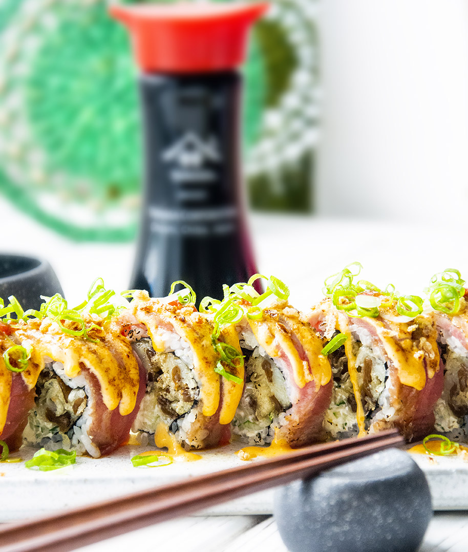 Ніжні шматочки свіжого тунця ідеально поєднуються з екзотичним смаком маринованого гарбузу. Ароматний рис, обмотаний в тонку водорость норі, стирає межі між різними кухнями, а пікантні соуси надають страві особливий смаковий вибух.